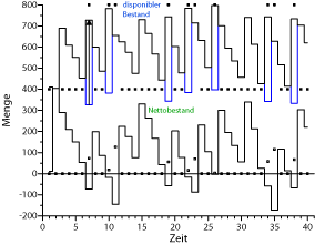 Der disponible Lagerbestand ist die Summe aus Nettobestand und Bestellbestand (ausstehende Bestellungen). Im folgenden Bild sieht man oben den disponiblen Lagerbestand und unten den Nettobestand. Der positive Teil des Nettobestands ist der physische Lagerbestand, während der negative Teil des Nettobestands der Fehlbestand ist. Die Orientierung am disponiblen Lagerbestand verhindert unnötige Mehrfachbestellungen.