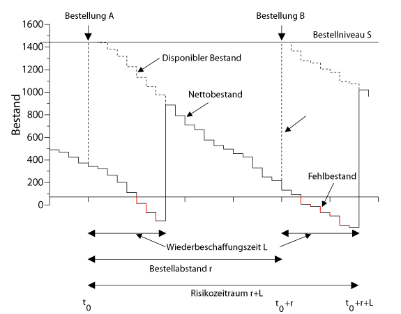 Die Höhe des Bestellniveaus wird so bestimmt, daß ein angestrebter Servicegrad im Risikozeitraum erreicht wird. Nimmt man an, daß die Nachfrage stationär ist, d.h. wenn die Charakteristik der Nachfrage sich im betrachteten Zeitraum nicht verändert, dann bleibt das Bestellniveau konstant.