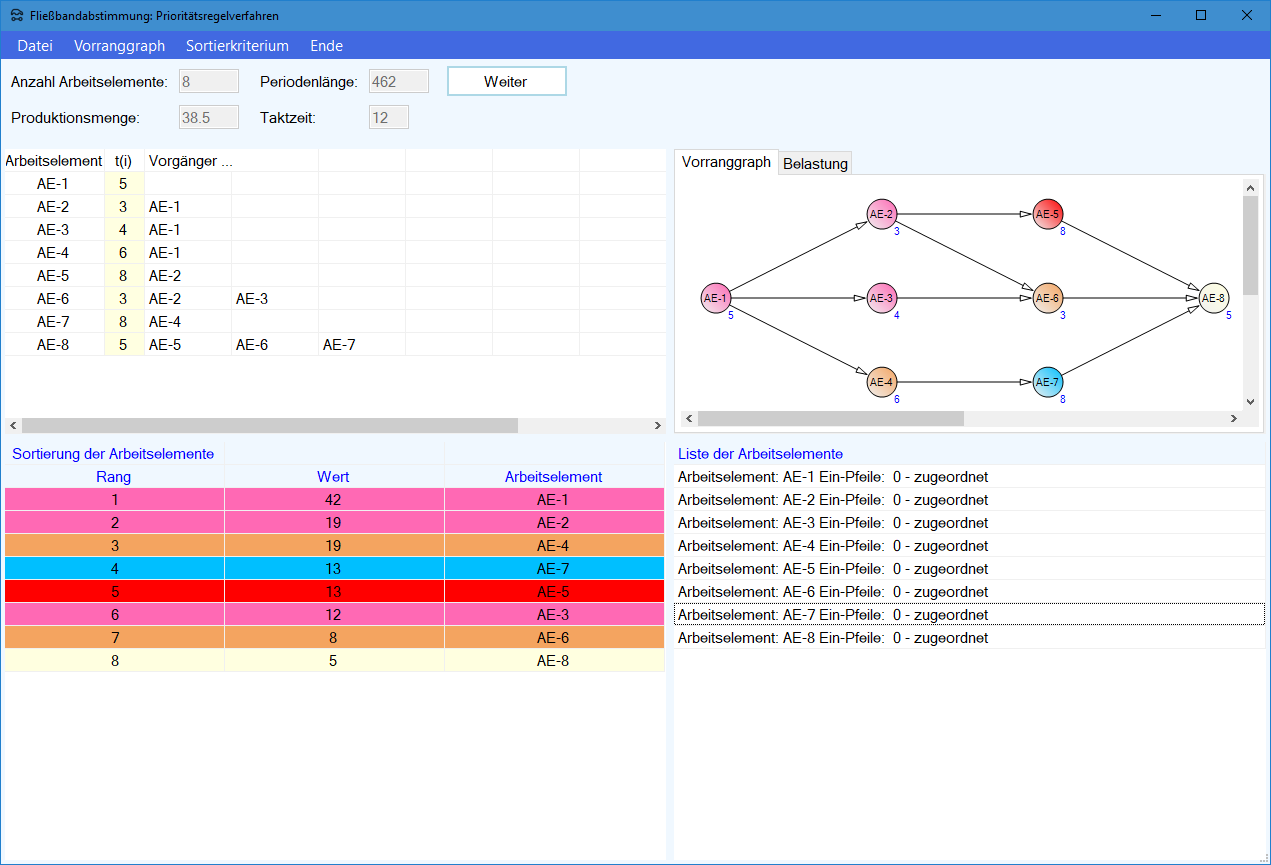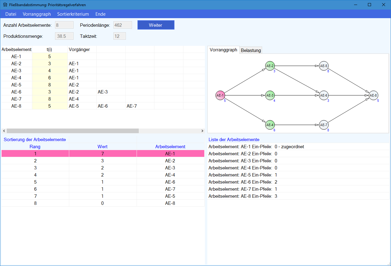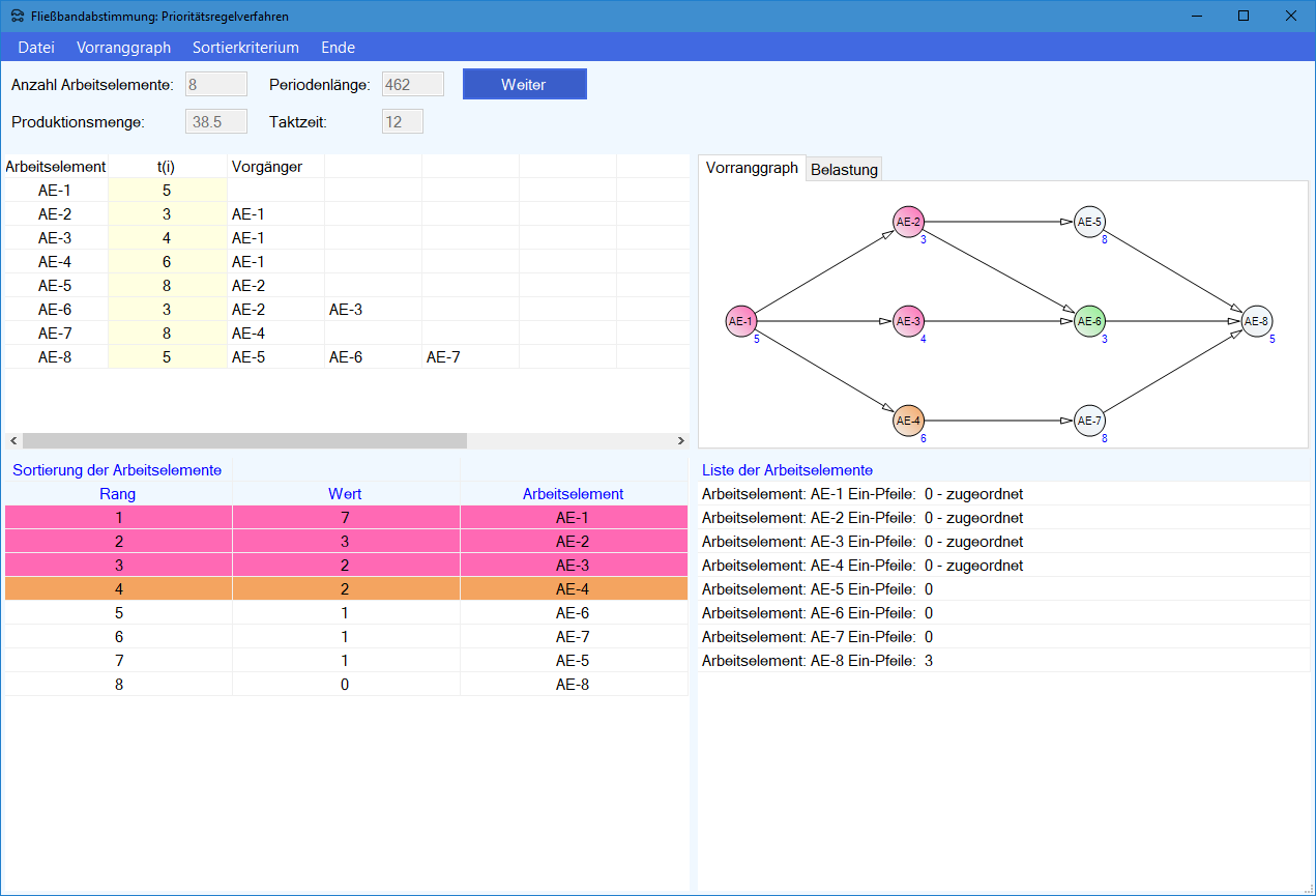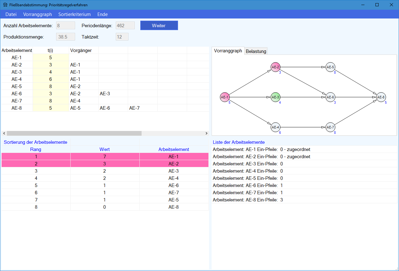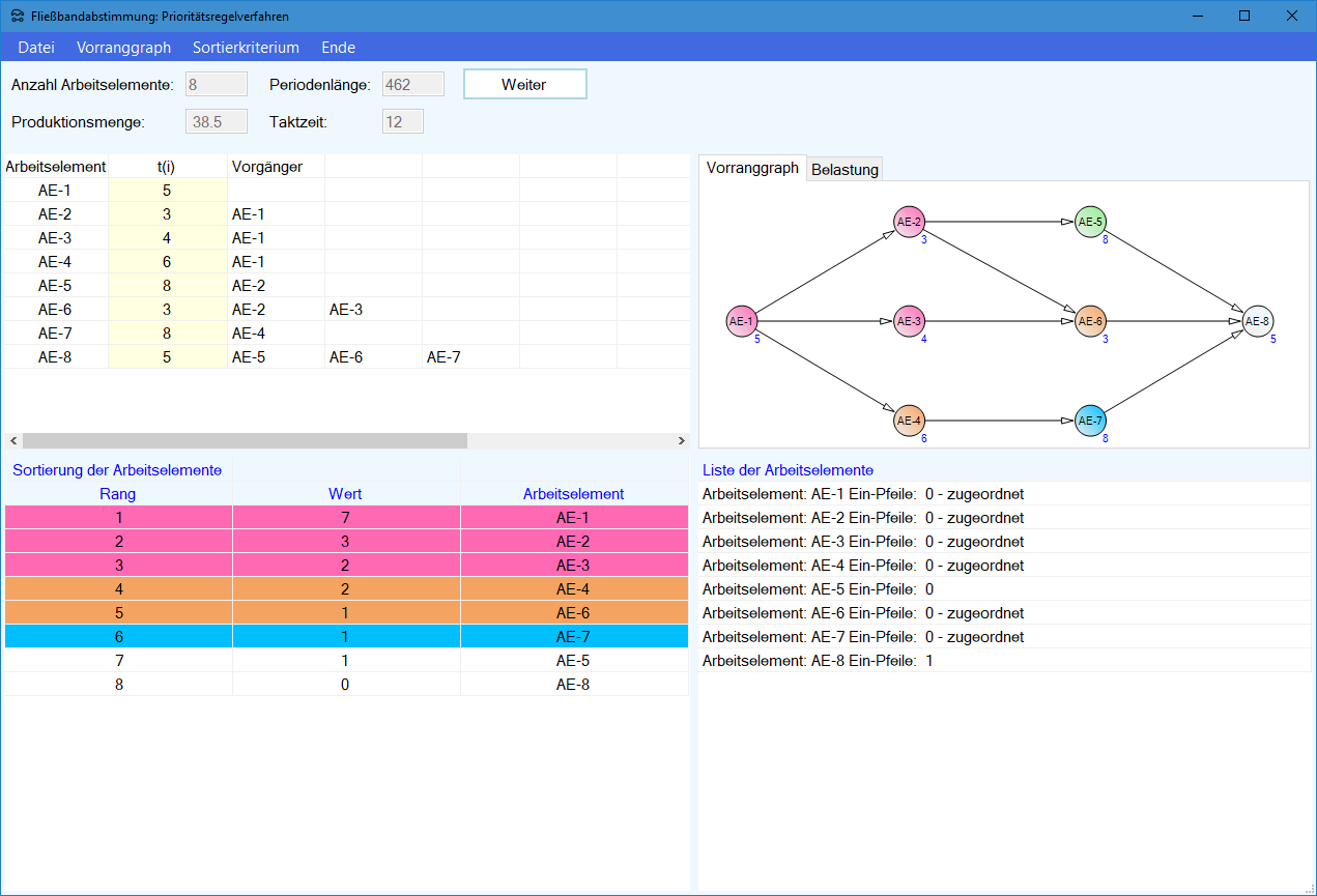 Zur Lösung dieses sog. Fließbandabstimmungproblems gibt es zahlreiche Modelle und exakte sowie heuristische Lösungsverfahren. Ein heuristisches Verfahren, das mit Prioritätsregeln arbeitet, ist im Produktions-Management-Trainer implementiert.