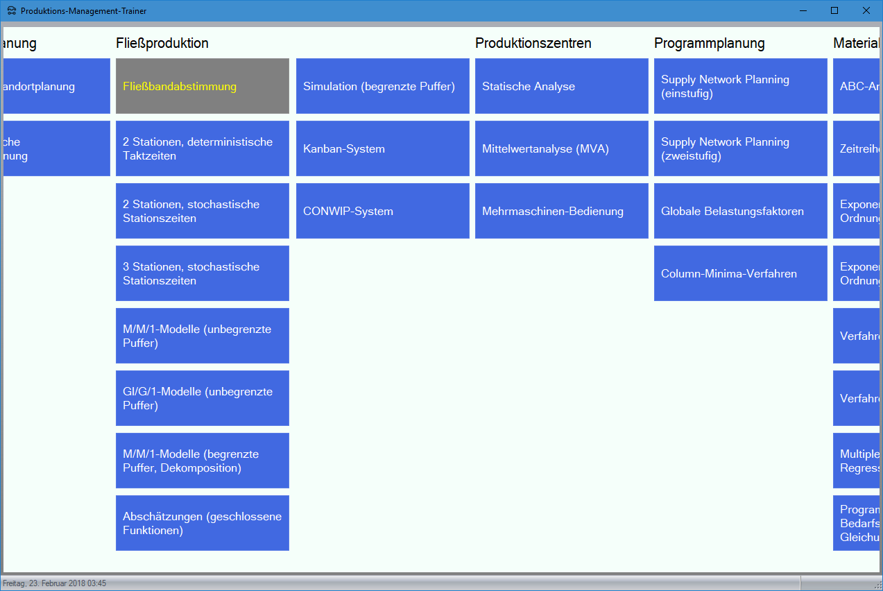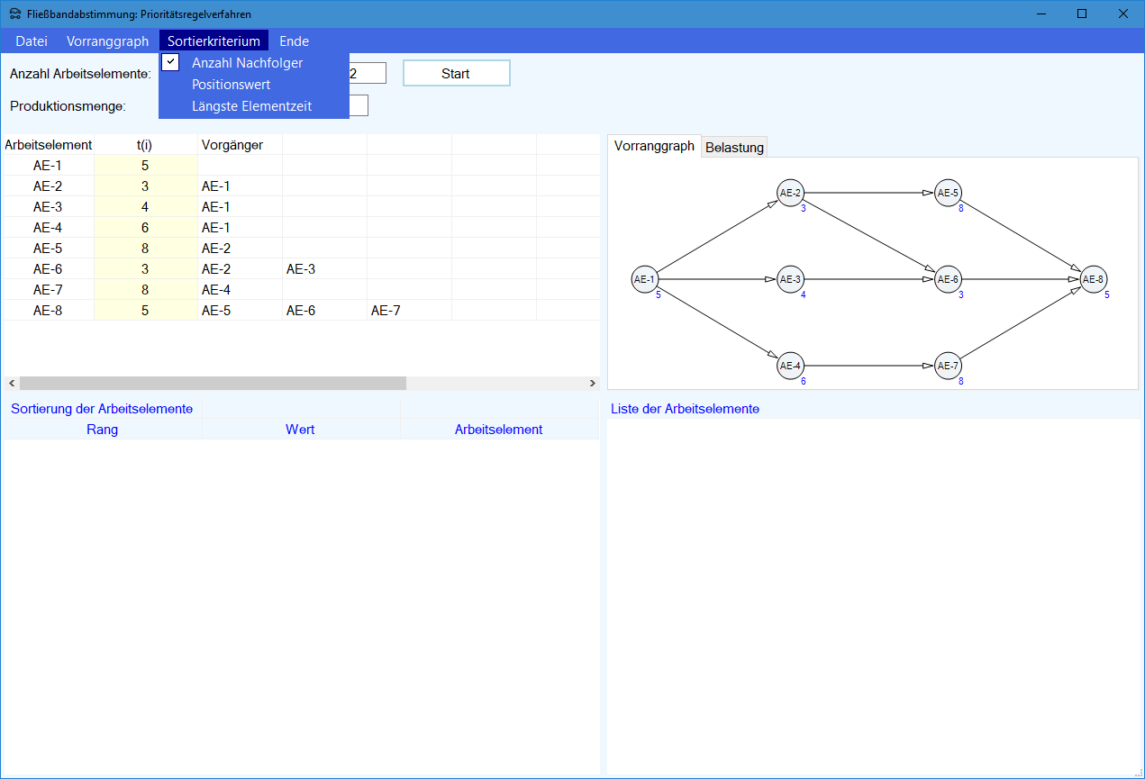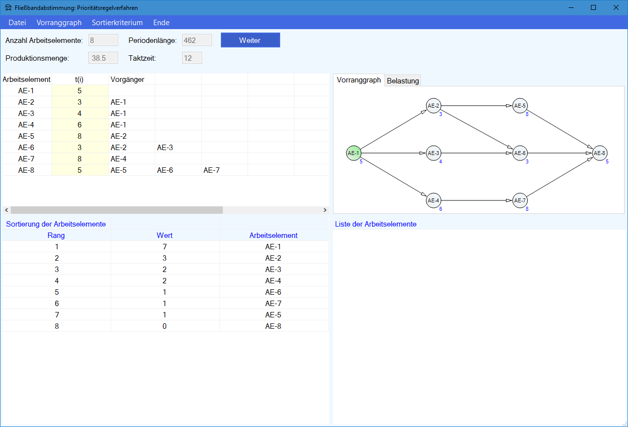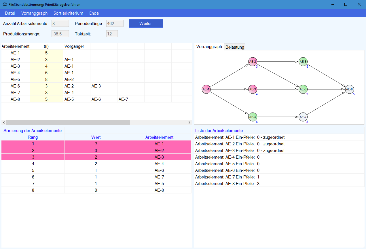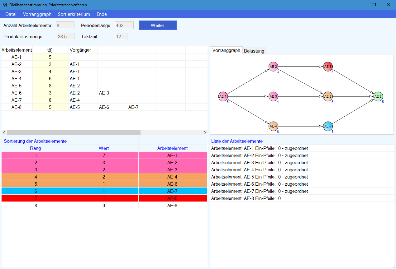 Zur Lösung dieses sog. Fließbandabstimmungproblems gibt es zahlreiche Modelle und exakte sowie heuristische Lösungsverfahren. Ein heuristisches Verfahren, das mit Prioritätsregeln arbeitet, ist im Produktions-Management-Trainer implementiert.