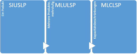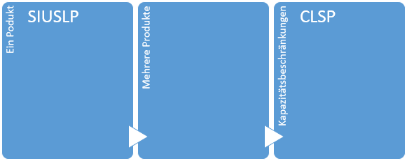 Der mittlere Kasten im unteren Bild ist leer, da einstufige Mehrprodukt-Probleme ohne Kapazitätsbeschränkungen kein neues Modell erfordern, sondern durch mehrere Modelle vom Typ SIULSP gelöst werden können.