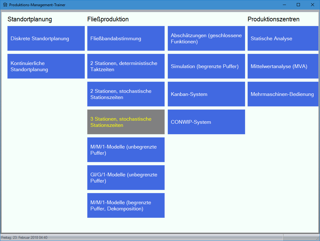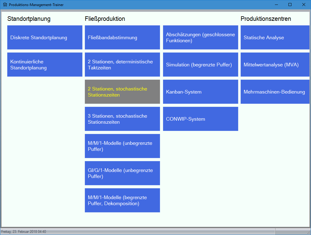 Modul 2-Stationen-Fließproduktionssystem mit exponentialverteilten Bearbeitungszeiten im Produktions-Management-Trainer: