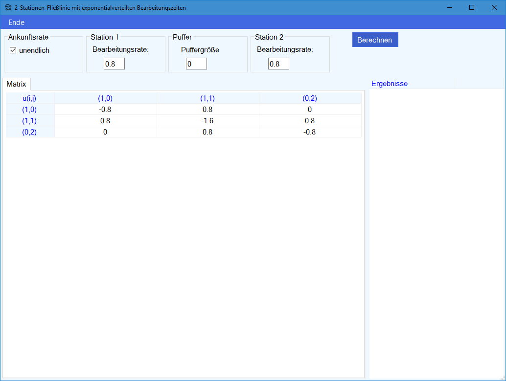 Im vorliegenden Anwendungsfall beträgt für die Puffergröße $c=0$ die Übergangsrate zwischen den Zuständen $i=0$ und $j=1$: $q_{01} = \lambda$.