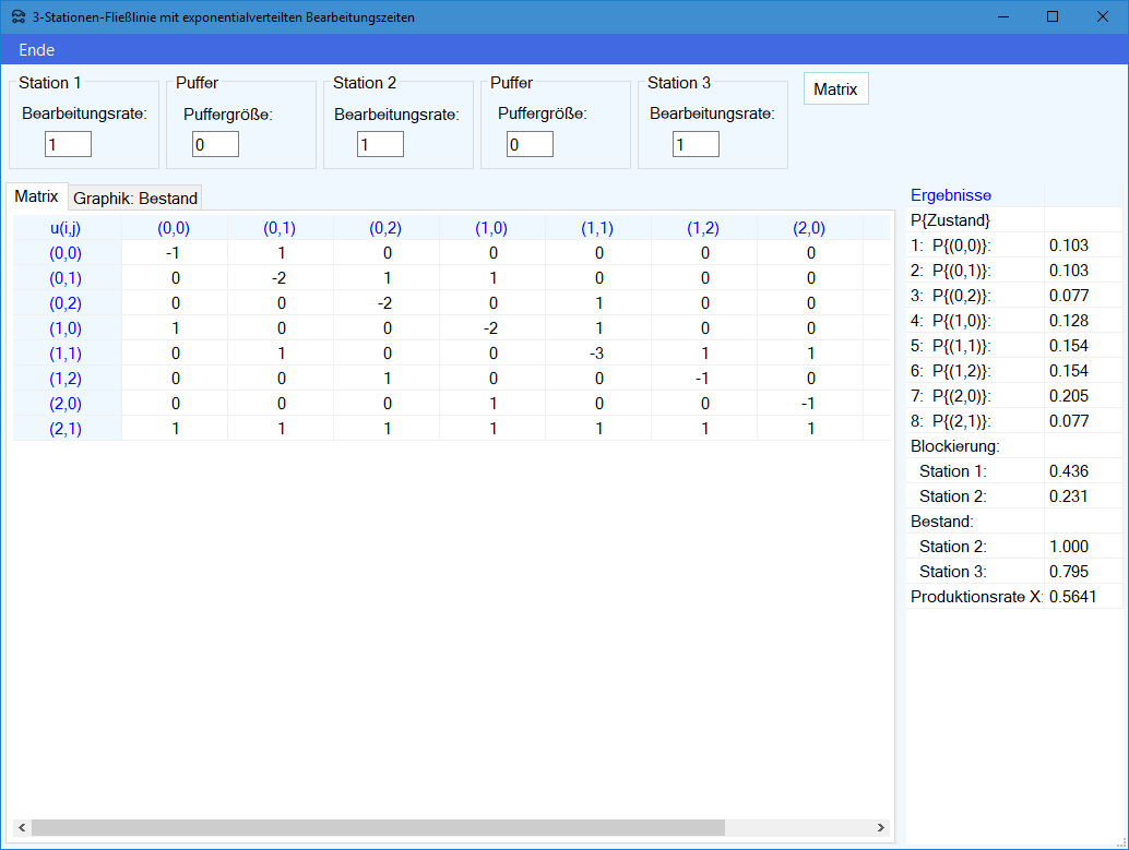 Das Gesamtsystem kann nicht leer sein, da Station 1 niemals unter Materialmangel leidet und somit immer entweder arbeitet oder blockiert ist. Zustandsveränderungen entstehen durch die "Bearbeitungsende"-Ereignisse an einer arbeitenden Station. Ist eine Station leer oder blockiert, dann tritt ein solches Ereignis nicht auf.