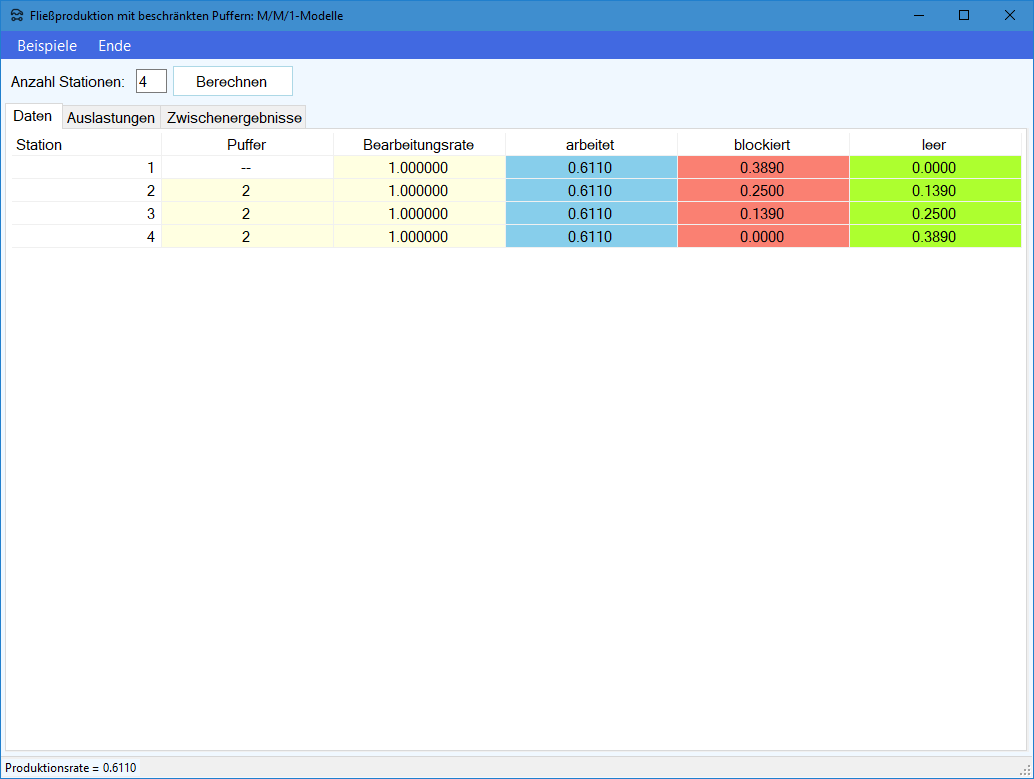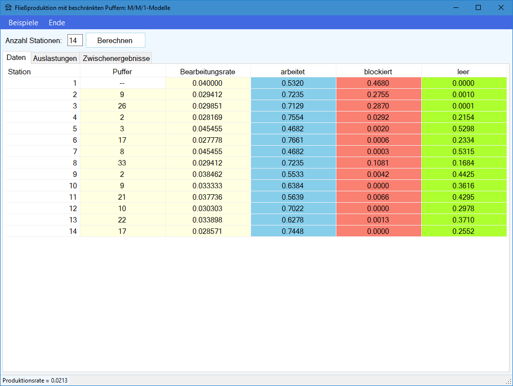 auch die Produktionsrate $X(m-1,m)$ des vorgelagerten Subsystems $(m-1,m)$ berechnen. Die Berechnung der Produktionsrate eines 2-Stationen-Subsystems wird hier im Detail beschrieben.