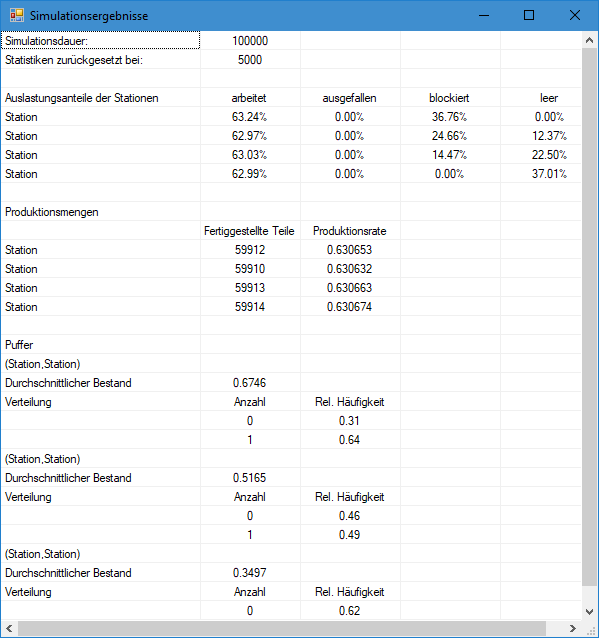 Bei unbeschränkten Puffern konnte die Produktionsrate des Fließproduktionssystems aus der Leistungsfähigkeit des Engpasses abgeleitet werden. Der Engpaß konnte einfach als Station mit der längsten mittleren Bearbeitungszeit identifiziert werden. Wenn Blockierungen an den Stationen auftreten können, dann heißt dies, daß die prinzipiell produktiv nutzbare Zeit einer Station nicht nur aus den Phasen "beschäftigt" (arbeitet) und "unbeschäftigt" (starved) besteht. Vielmehr kommt nun noch hinzu, daß die Station "blockiert" (blocked) sein kann. Bei Störungen kommt auch noch der Zustand "gestört" hinzu.