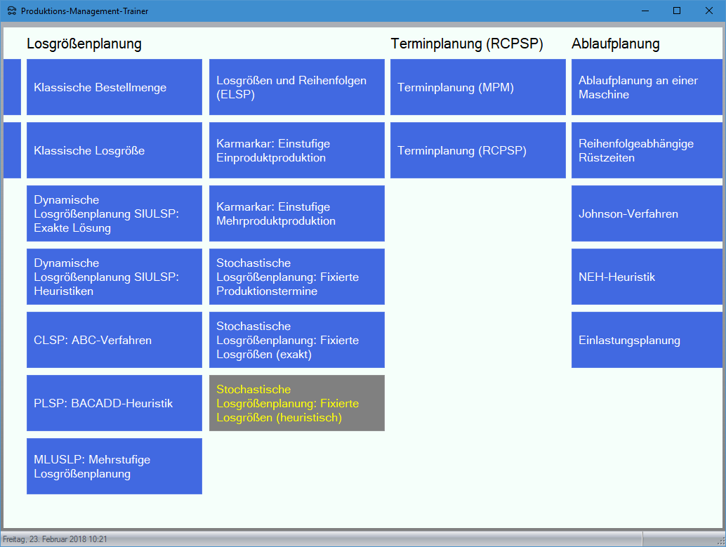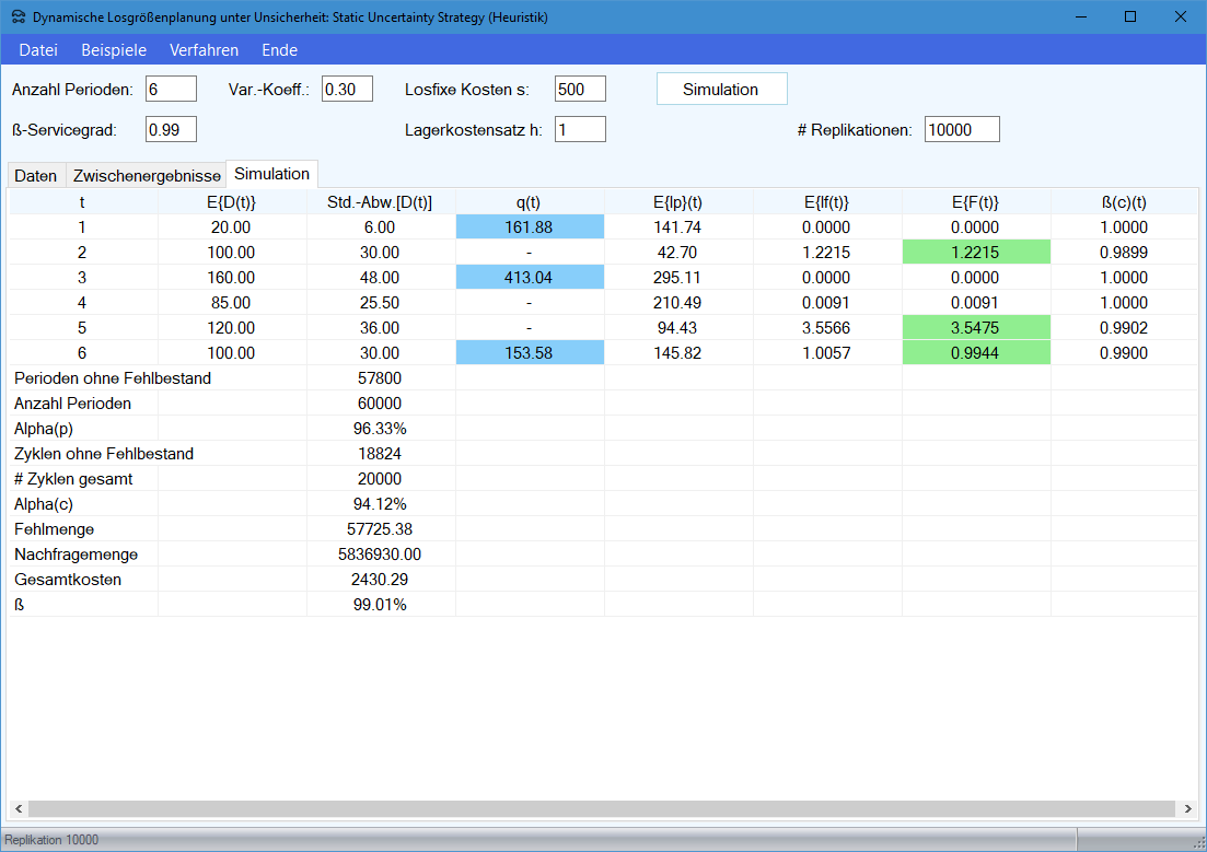 Modul Stochastische Losgrößenplanung: Fixierte Losgrößen (heuristisch) im Produktions-Management-Trainer: