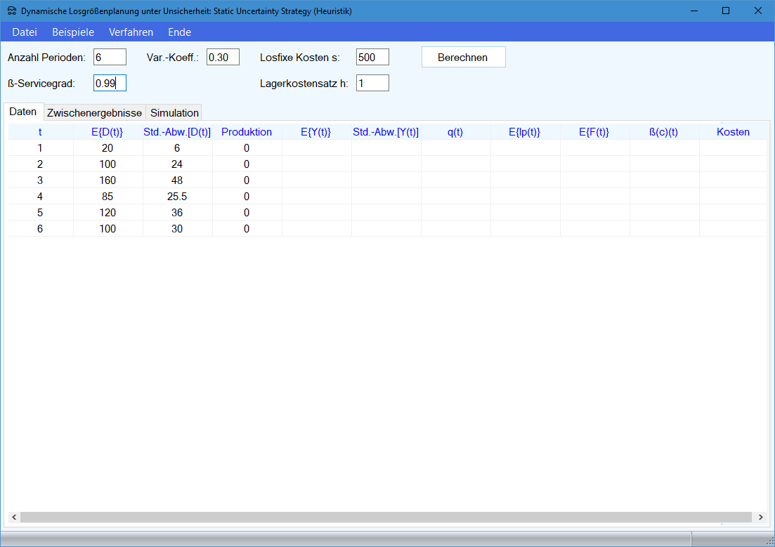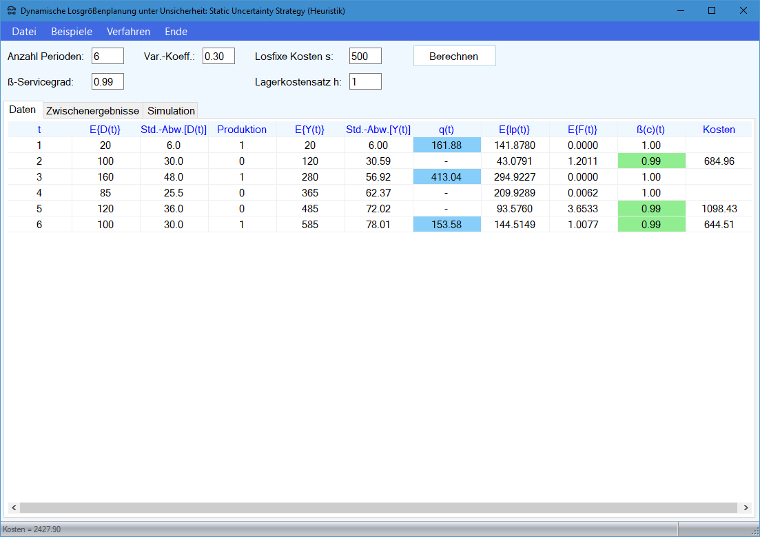 Weitere Erläuterungen sind im Lehrbuch zu finden. Der Produktions-Management-Trainer enthält ein Modul, in dem die Berechnungen Schritt für Schritt protokolliert werden.