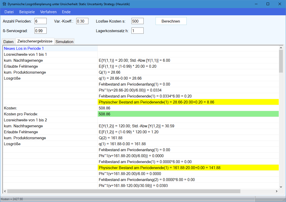 Im Folgenden werden die Berechnungen für das Beispiel zum Silver-Meal-Verfahren bei stochastischer dynamischer Nachfrage an einem Beispiel detailliert erklärt: